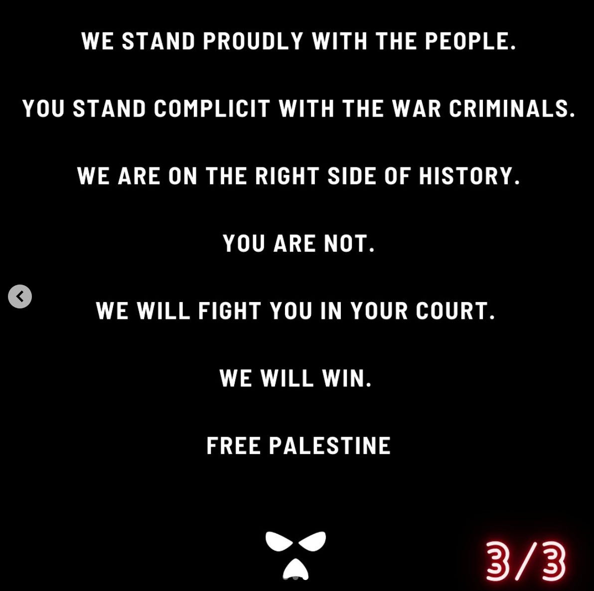 Authorities had considered charging them for seeming to encourage a “riot” outside their next court appearance, followed quickly by "No riots, just love and support, and support for Palestine."