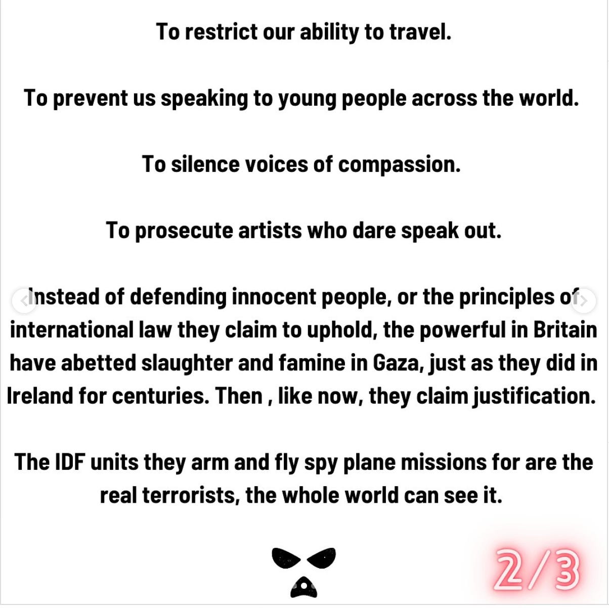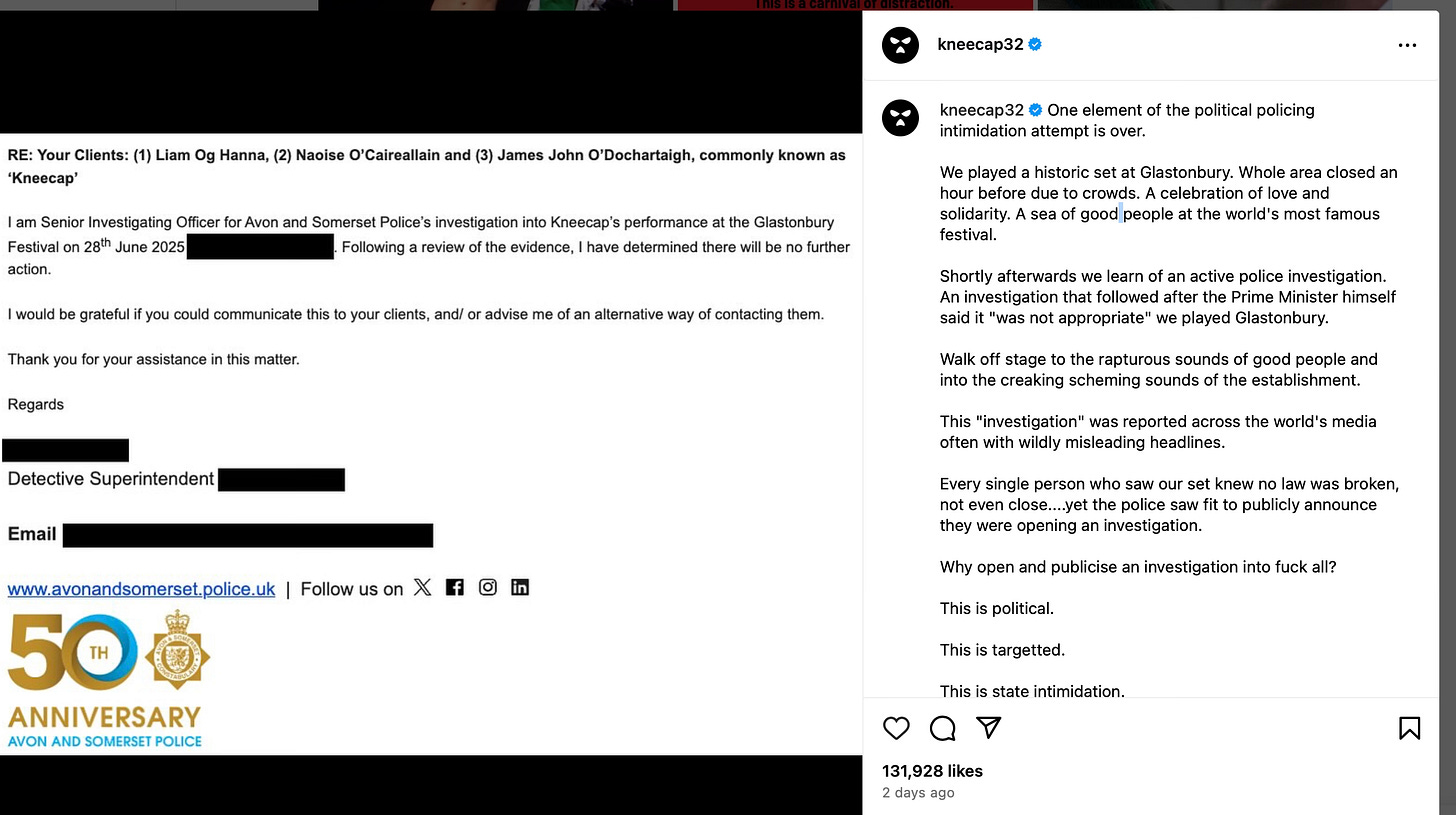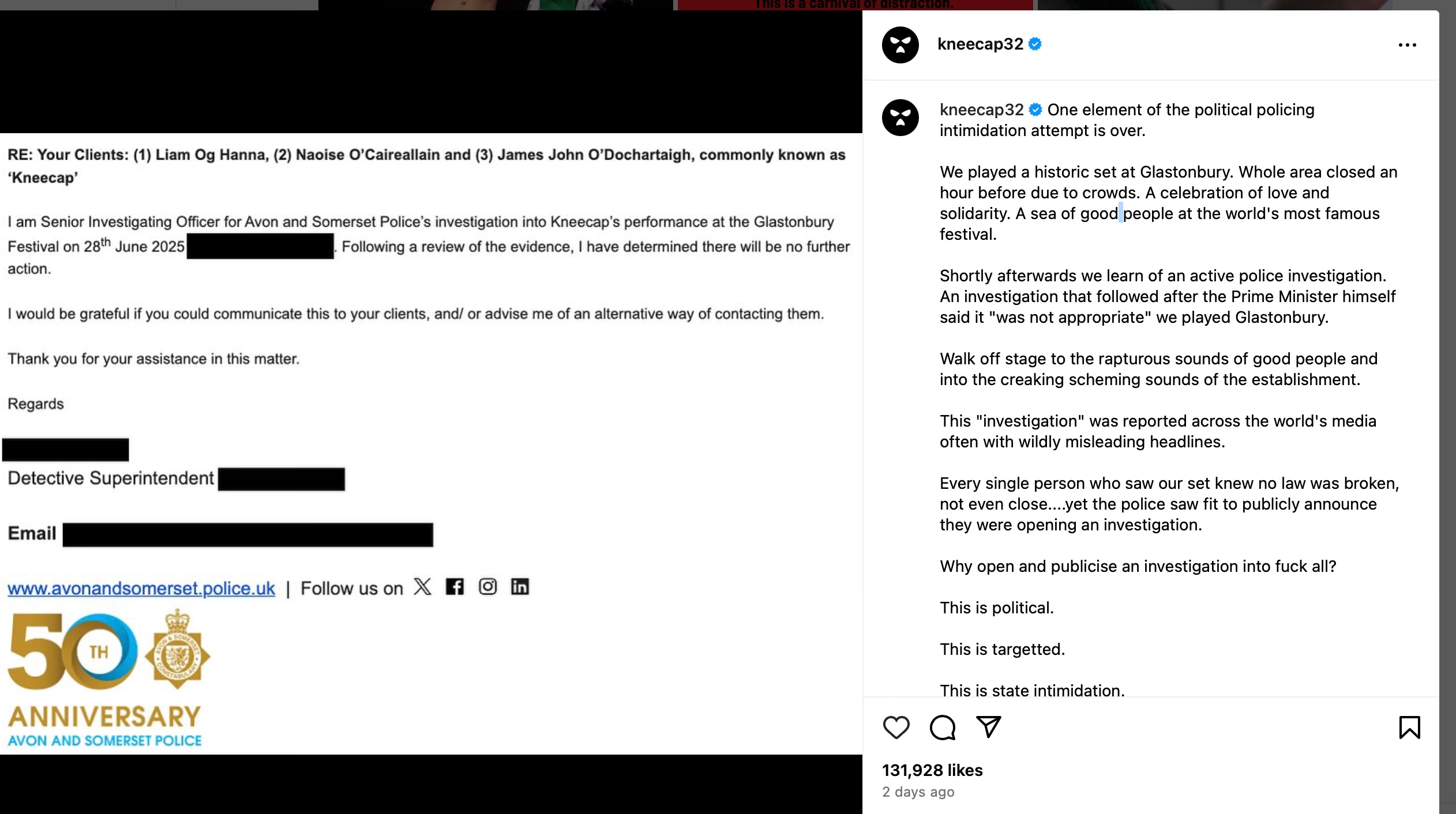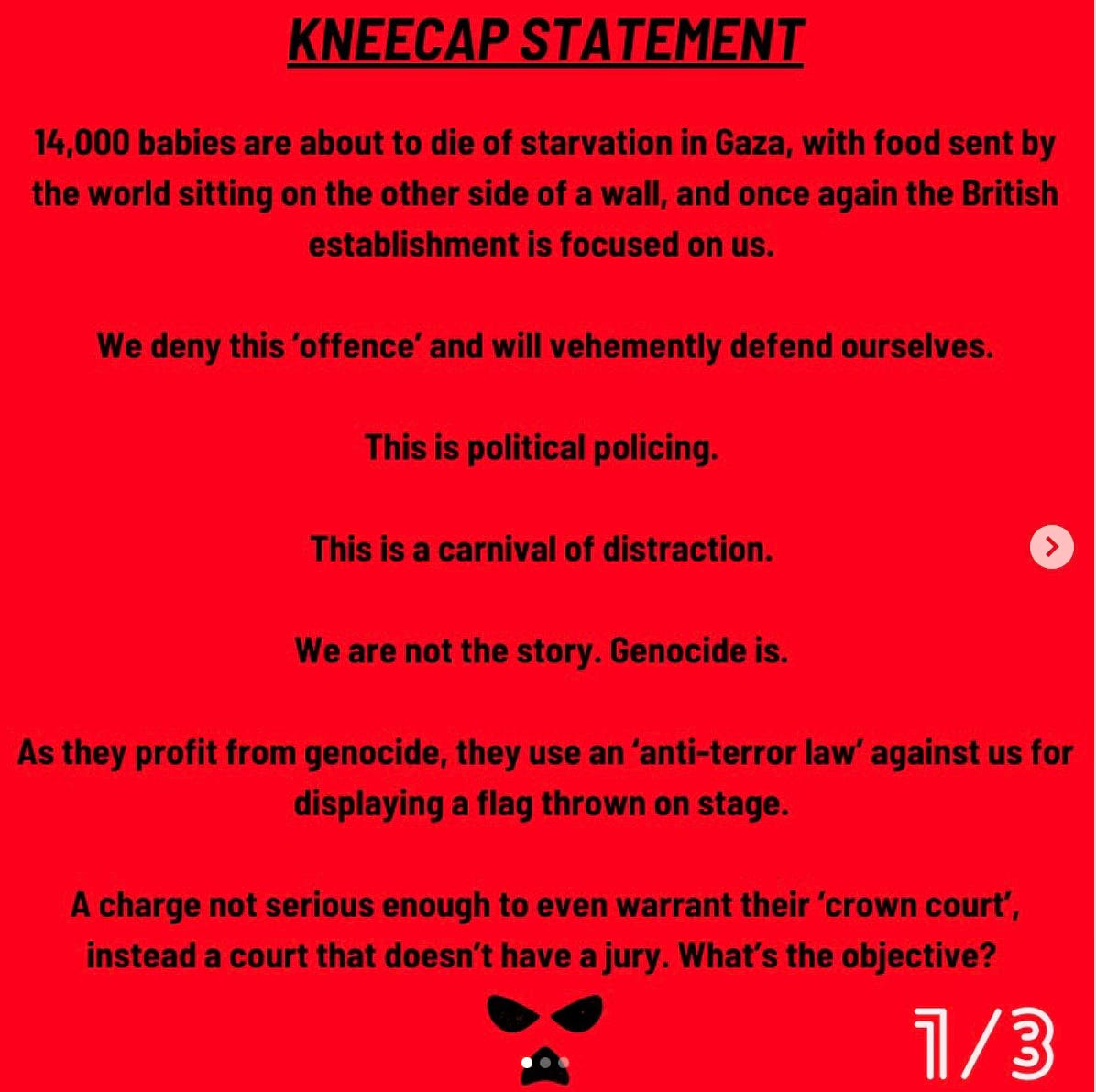 Kneecap posted extensively on Instagram and elsewhere about the case during the Summer of 2025, including a notice that they would not be prosecuted for their performance at Glastonbury: