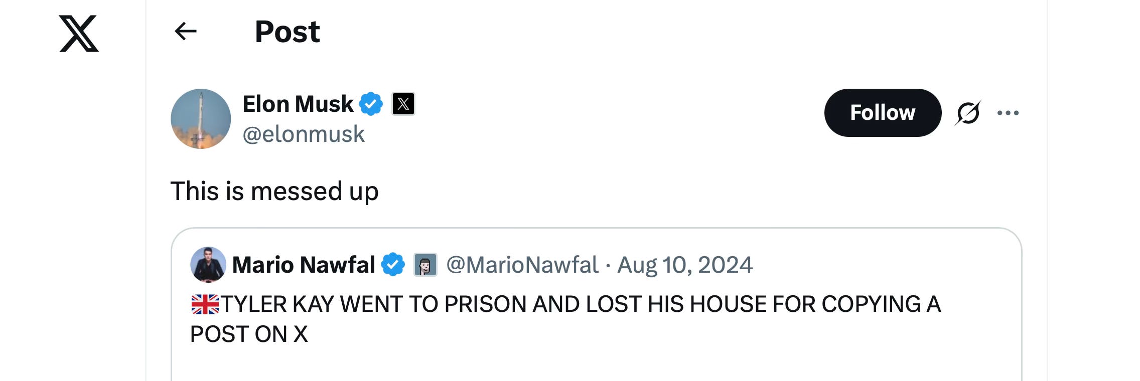 TYLER KAY WENT TO PRISON AND LOST HIS HOUSE FOR COPYING A POST ON X Tyler was sentenced to 38 months in prison for copying a post made on X by Lucy Connolly, the wife of a Conservative councilor. The post read: “Mass deportation now, set fire to all the f*king hotels full of the ba*ards for all I care…If that makes me a racist, so be it.” Lucy had been arrested for the post, and Tyler was trying to prove that he wouldn’t be arrested. He made this clear in a reply to his post, stating: “My point is more, it’s one rule for some and another rule for others.” Despite his barrister explaining he was immature, had grown up in care, and would lose his council house as a result of a prison sentence, the judge said he “clearly intended to incite serious violence.” He then sent Tyler, a father of 3, to prison for 3 years and 2 months. Sources: Northampton Chronicle, Independent